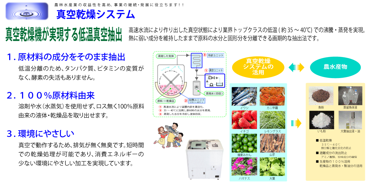 天然素材を活用した農法と付加価値の高い商品を生み出す真空乾燥加工システムを活用した農水産物の加工により農業発展に取り組みます。